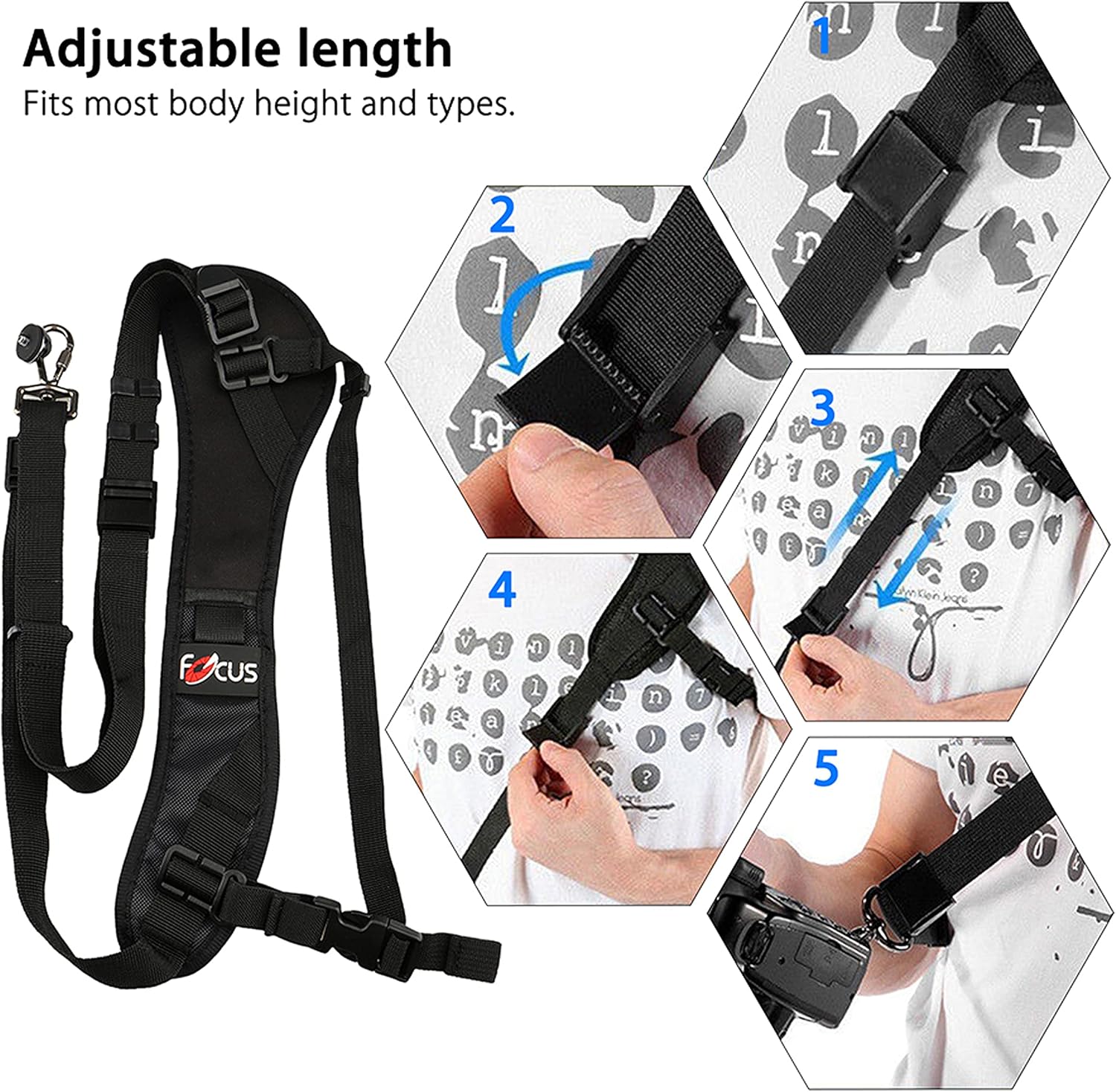 - 【Adjustable length】: you can adjust the length of the strap to a comfortable length for your body, allows your camera to hang in a convenient, out-of-the way position on your body, but always at the ready for a quick shot.