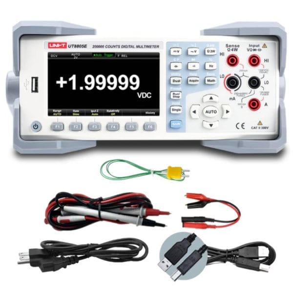 - 3.8 Digit Display, Auto-Ranging, TRMS, 5,999 Counts, 0.3% Accuracy. Accessories: USB printing cable, UT-L41 alligator clip short test cable, multimeter test leads, K-type thermocouple, adapter socket UT-S03A, Power cord, English download guide, multi-language safety manual, calibration report COC, UT8800 series safety instructions attachment.